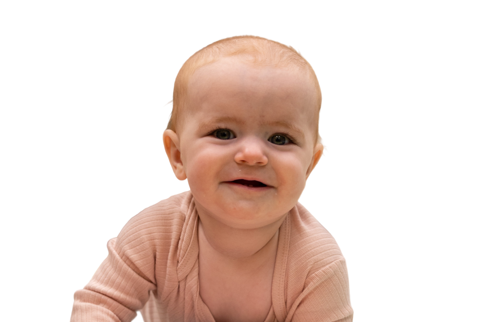 Smiling baby at Lionheart Children’s Academy on a blue background